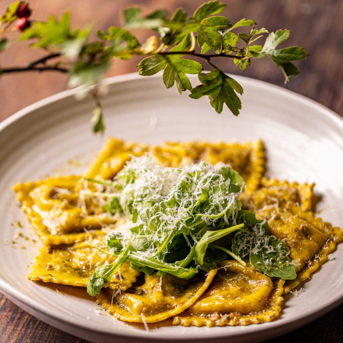Somerset pork & fennel ravioli, brown butter, pesto 573 kcals