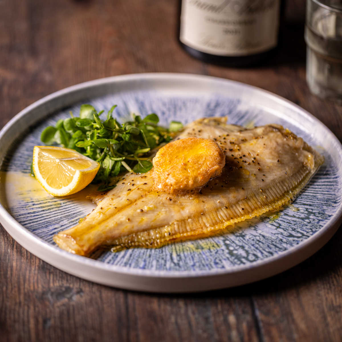 Scottish Loch trout, pan-fried with garlic prawns, buttered greens 620 kcals