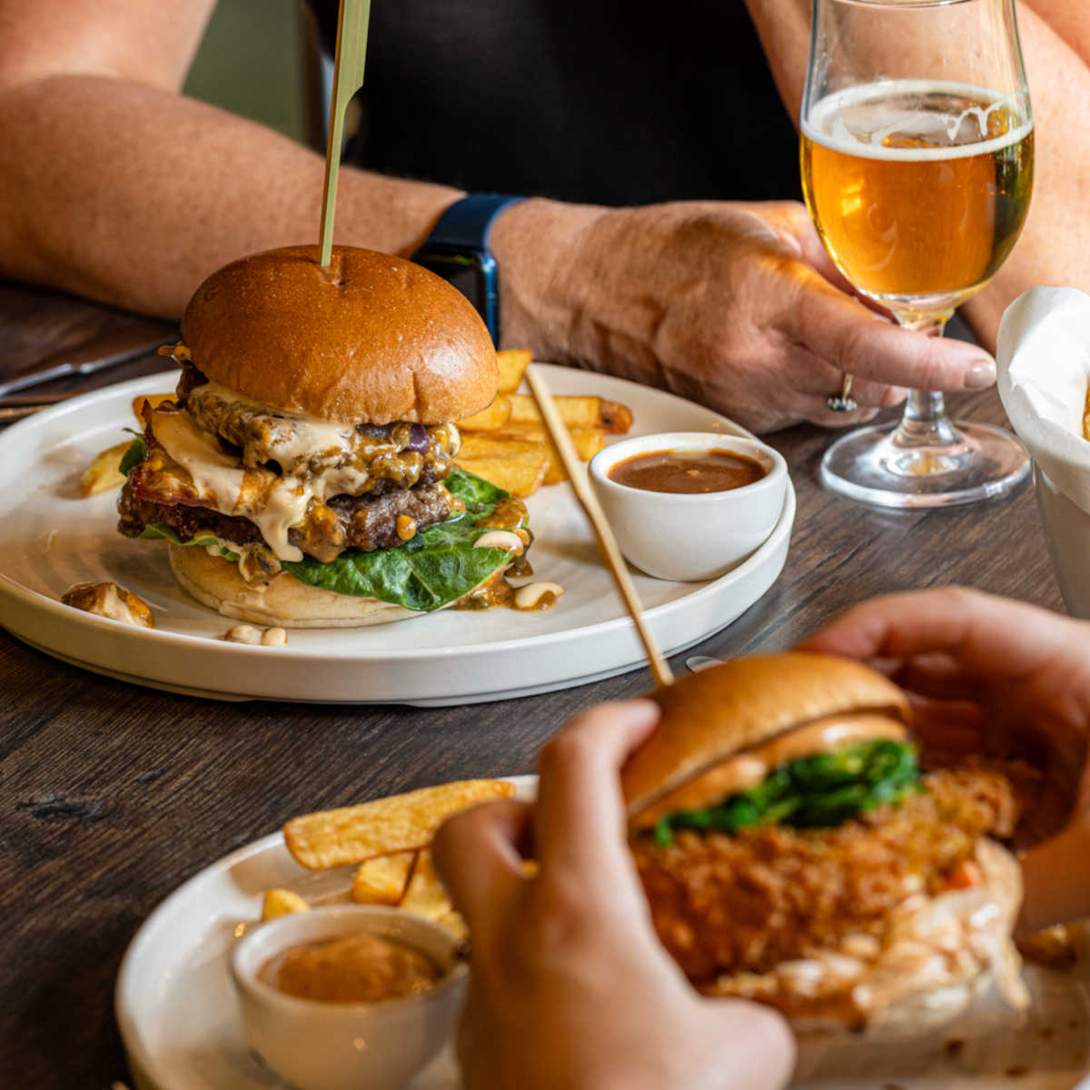 Beef burger, cheese, bacon, skin-on chips | 7.5 574 kcals