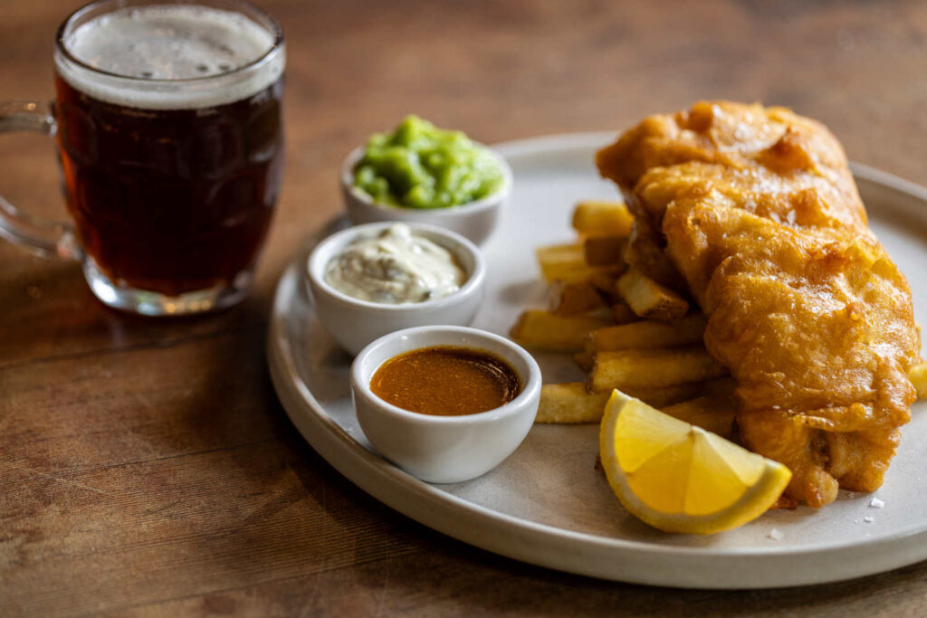 Beer-battered fish & chips, minted mushy peas, homemade tartare, curry sauce | 18.5 1657 kcals