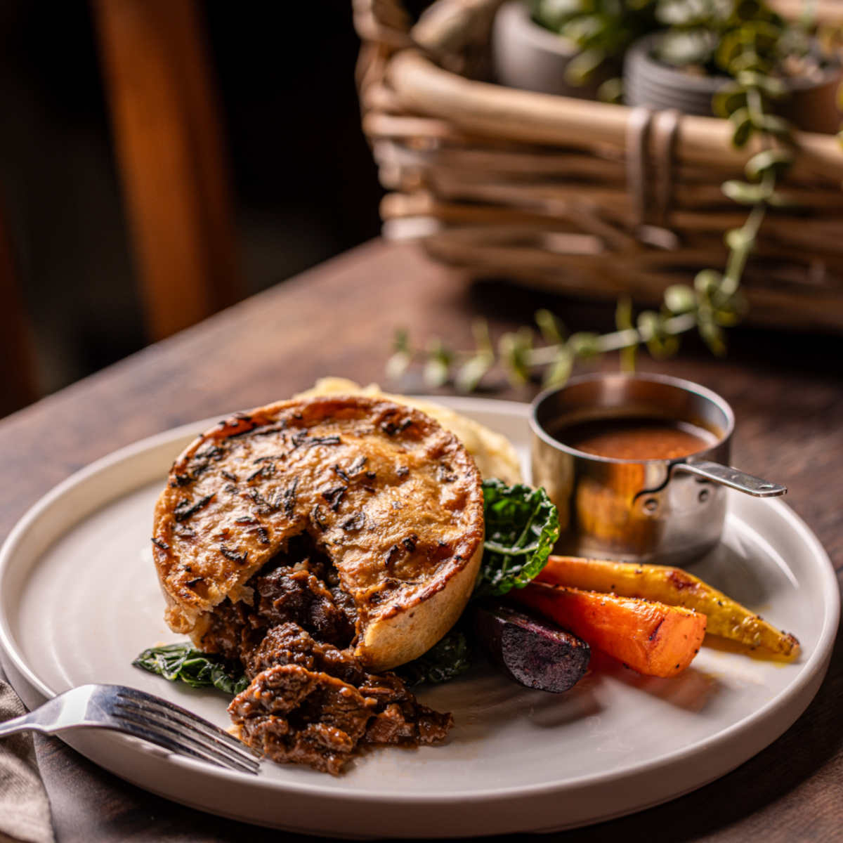 British, organic steak & ale pie, mash, roasted roots, buttered cavolo nero | 17.5 1107 kcals