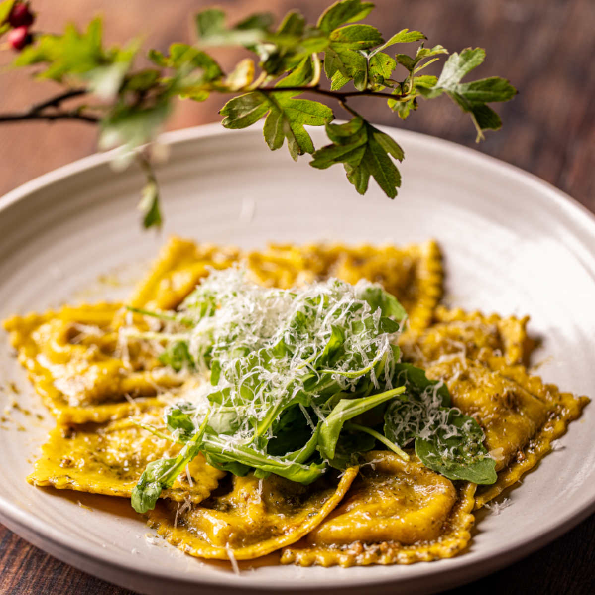 Somerset pork & fennel ravioli, brown butter, pesto 573 kcals