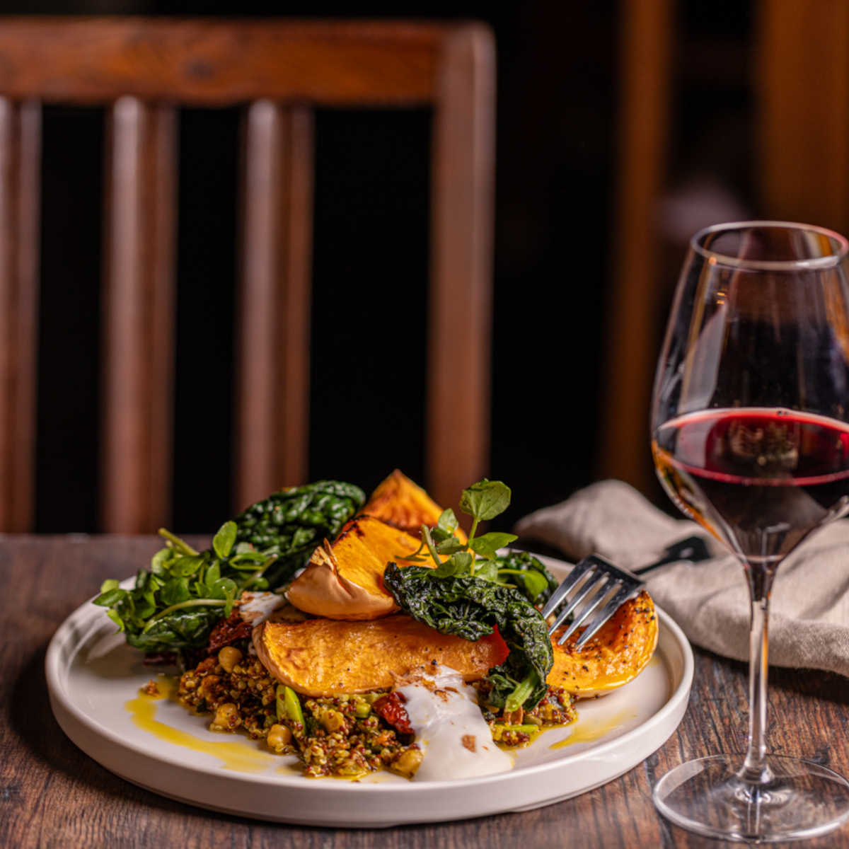 Warm roasted butternut squash salad, cavolo nero, green beans, herb yoghurt (ve) | 14.5 169 kcals